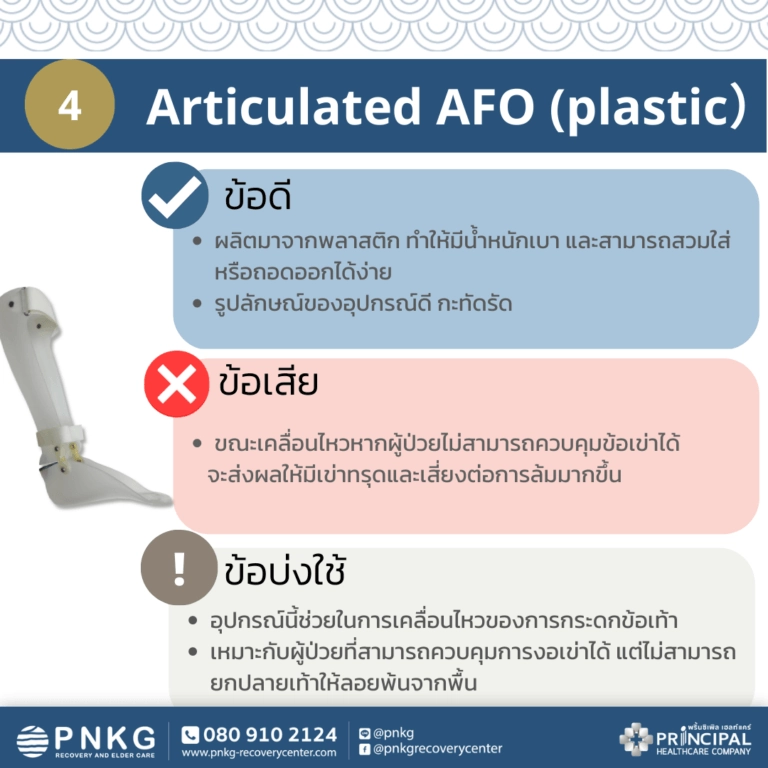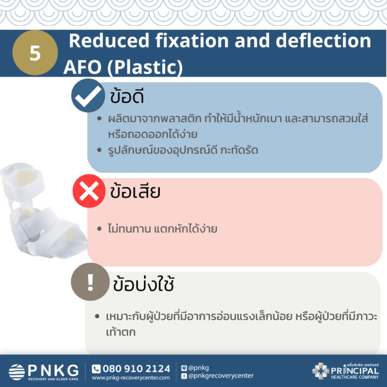 ผลิตมาจากพลาสติก ทำให้มีน้ำหนักเบา และสามารถสวมใส่หรือถอดออกได้ง่าย รูปลักษณ์ของอุปกรณ์ดี กะทัดรัด แต่ขณะเคลื่อนไหวหากผู้ป่วยไม่สามารถควบคุมข้อเข่าได้ จะส่งผลให้มีเข่าทรุดและเสี่ยงต่อการล้มมากขึ้น