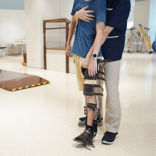 เช่น การฝึกผู้ป่วยโรคหลอดเลือดสมองหลังได้รับการผ่าตัดสมองในระยะที่มีความคงที่ของพยาธิสภาพ ด้วยการเดิน ซึ่งในระยะนี้ ผู้ป่วยจะยังไม่สามารถช่วยเหลือตนเองได้มาก และในบางรายอาจมีการรับรู้ที่ไม่สมบูรณ์ การใช้กายอุปกรณ์ ประเภท Knee Ankle Foot Orthosis:KAFO ซึ่งอุปกรณ์ดามรยางค์ขาผู้ป่วยตั้งแต่ระดับต้นขาถึงข้อเท้า จะถูกนำมาใช้ในการฝึกผู้ป่วยระยะนี้ โดยจุดประสงค์เพื่อให้ผู้ป่วยสามารถจดจ่อกับการควบคุมการหดตัวและใช้งานของกล้ามเนื้อสะโพก ตามการฟื้นตัวของระบบประสาทที่จะสามารถควบคุมรยางค์จากส่วนต้นสู่้ส่วนปลาย อีกทั้งยังเพิ่มการตื่นของระดับความรู้สึกตัวของผู้ป่วย (consciousness level) ผ่านการกระตุ้นด้วยการเคลื่อนไหวได้อีกด้วย (Dynamic stimulation) ได้อีกด้วย
